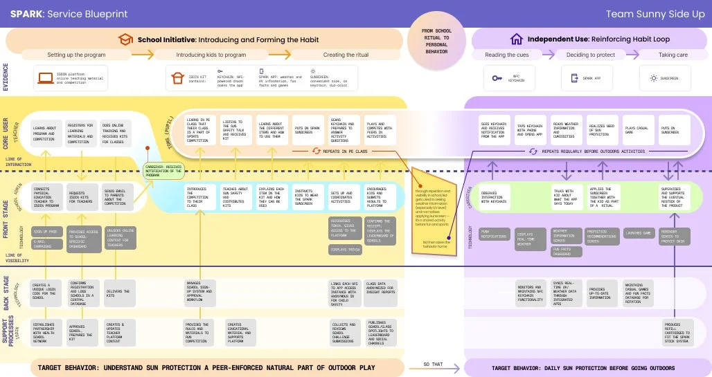 SPARK emerged as a playful service ecosystem that transforms sun protection from invisible, parent-dependent task into a visible, peer-reinforced habit. Our solution combines three elements: colored sunscreen for expressive protection, NFC-enabled keychains unlocking a digital platform, and seasonal school competitions. SPARK addresses systemic barriers through behavioral design, making protection feel natural, social, and fun while building lifelong healthy habits.